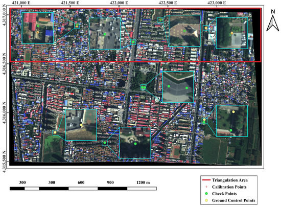 In addition to the information provided, the results of the boresight calibration process using actual measured GCPs were provided. Specifically, 11 GCPs were selected in the city area and their locations were obtained using the CHCNAV X6 Real-Time Kinematic (RTK) terminal. The CHCNAV X6 RTK terminal has nominal planar accuracy of mm and nominal elevation accuracy of mm in RTK mode. To ensure positioning accuracy, four control points were established at the north-east outside of the city area, where the maximum linear distance was less than 4.3 km, and Continuously Operating Reference Stations (CORS) were utilized for RTK. The locations of the 11 GCPs in the city area can be found in Figure 9.