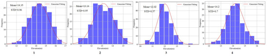 With reference boresight angles, we triangulated the features and obtained their 3D locations. In order to compare the accuracy of the methods in the absence of GCPs, we utilized uncorrected POS data for subsequent analyses. The statistics of features’ elevation in EGM96 Geoid and relative histograms are shown in Figure 11.