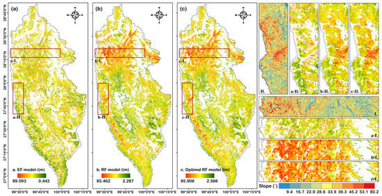 - Combining empirical function regression and random forest regression models, the highest precision canopy height data in Shangri-La can be obtained in the random forest regression model with the optimal feature variables, with an R2 of 0.865 and an RMSE of only 3.184 m. In addition, the poor inversion effect of the parametric model is primarily due to the lack of consideration of topographical and meteorological factors, which is unsuitable for canopy height inversion under complex terrain conditions.