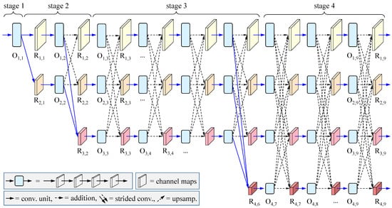 where ReLU stands for the rectified linear unit, are the transformation functions and P is the number of streams with different resolutions, which changes within different stages. More specifically, as shown in Figure 1, in the second stage, , and ; in the third stage, , , and ; and in the fourth stage, , , and . In addition, for the function , in the case of , it is an identity mapping; in the case of , it is a convolution with stride 2; and in the case of , it is a bilinear up-sampling operation with convolution for feature alignment.