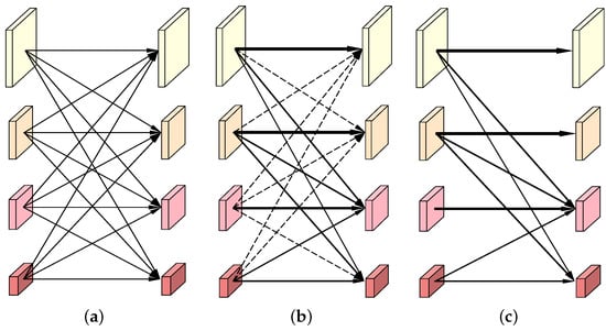 In this subsection, we use one of the dense connection units at stage 4 of HRNet to illustrate the whole sparse optimization process in the order from Figure 2a–c. To be more specific, Figure 2a depicts the dense cross-resolution connections of the original HRNet, which are also the candidates to be selected by the APG algorithm. At the beginning of the training stage, the weights of these connections are all set to 1.0 to guarantee that all of them have an equal probability to be selected. Figure 2b visualizes a group of learned weights using a solid line and a dashed line. The thicker the solid line is, the greater the weight is and the more important the connection is. In particular, the dashed lines indicate those connections are of zero importance, which could be directly cut off. Figure 2c shows the finally selected connections, which will be used at the inference stage of DyHRNet.