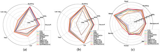 With the great success of deep learning on semantic segmentation for natural images, tremendous efforts have been made by researchers to transfer deep models for RS images [,]. Architecturally, most of the models have been formulated with convolution, pooling, and up-sampling operations, such as the Fully Convolutional Network (FCN) [], the UNet [], the Pyramid Scene Parsing Network (PSPNet) [], the DeepLab [], the OCRNet [], and so on. Later, some frameworks were constructed on the transformer. In this family, the SEgmentation TRansformer (SETR) [] and the SegFormer [] are two famous models. With the usage of encoder–decoder backbones, some variants have been constructed for this issue [,,,,,]. For example, the cascaded network with context information fusion was developed to extract confusing artificial objects []. The shuffling network is employed to enhance the feature learning ability []. These studies have primarily enhanced the semantic segmentation performance for RS images.