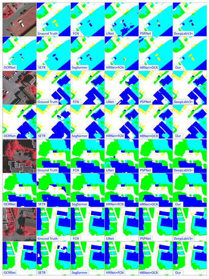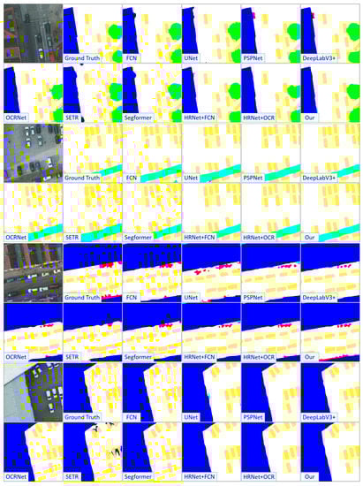 Potsdam: The Potsdam dataset has 38 samples with fine spatial resolution. On average, the size of the images is about 6000 × 6000 pixels, and the GSD is 5 cm. The samples in this dataset were taken from a scene in Potsdam City. Each sample contains three images with TOP, DSM, and ground truth, respectively. Each TOP includes the red, green, and blue bands. It has the same categories as those in the Vaihingen dataset. The DSM is not used for learning. A total of 3456 samples are randomly obtained from 24 images for training, and 2016 samples are randomly picked out from the remaining 14 images for testing. The samples are all cropped into patches of 512 × 512 pixels.