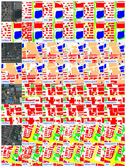 LoveDA: The LoveDA dataset contains 5987 samples []. Each image has 1024 × 1024 pixels, and the GSD is 0.3 m. The images in this dataset are collected in two senses: urban and rural. Each image includes red, green, and blue bands. The ground truth contains seven categories: building, road, water, barren, forest, agriculture and background. A total of 2522 images are taken for training, and 1669 images are used for testing.