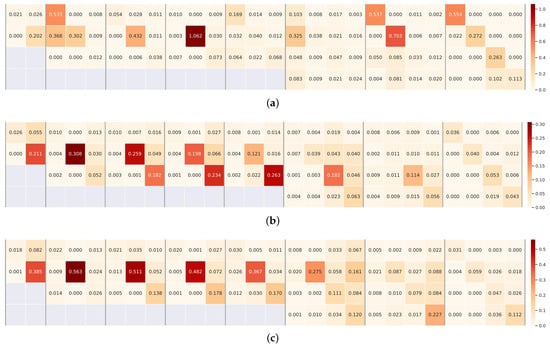 Based on the visualizations in Figure 9a–c, one interesting phenomenon is that all the connections at the same horizontal level retain relatively higher weights. This means that the feature maps at the same resolution should be maintained, which is more important for nonlinear feature learning. Small weights are always learned from cross-resolutions, and most of them correspond to the connections from high to low resolution. This may be because there are many tiny objects in the RS images, avoiding discarding the details of the tiny objects and performing those down-sampling operations.