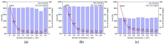 The mIoU score and the overall weight sum learned from the dense connections with iterations; (a) Vaihingen; (b) Potsdam; (c) LoveDA.