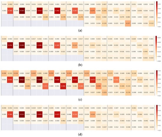 Visualization of the weights of the dense connections learned from the Vaihingen dataset with different settings. In each panel separated by vertical lines, there are a group of weights, corresponding to the connections in Figure 1. The weights in (c,d) are learned with all of the training samples used in Table 1. (a) The weights learned with 10% training samples; (b) The weights learned with 50% training samples; (c) The weights learned with 10,000 iterations; (d). The weights were learned with 20,000 iterations.