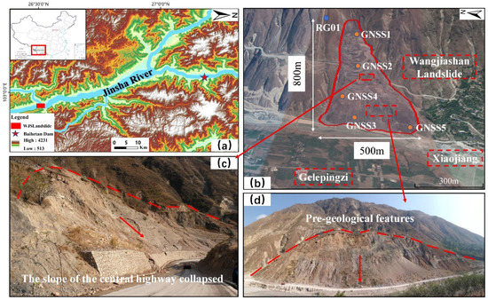 The case study’s site and the GPS monitoring stations. (a) The pattern of the Jinsha River system and study area DEM; (b) the Wangjiashan landslide boundary, rain gauge (RG01), and GNSS displacement monitoring point layout; (c) the slope of the central highway that collapsed; (d) geomorphological features of the landslide front.