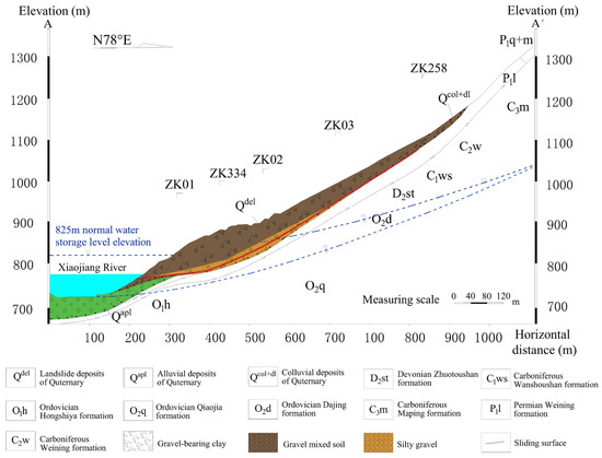 The landslide body has a total thickness ranging from 14.0 m to 87.6 m. While the leading edge and triggering zone of the landslide are thinner, the center of the slide is thicker, indicating that this is a large-scale soil landslide. The landslide material consists primarily of pebbles, blocks, and fragments mixed with soil, and the composition of the crushed and block stone is primarily limestone and dolomite, with sandstone in small amounts. The lower bedrock is composed of dolomite, quartz sandstone, and argillaceous siltstone. The soil in the slippery zone is composed of gravel-bearing clay, as illustrated in Figure 2.