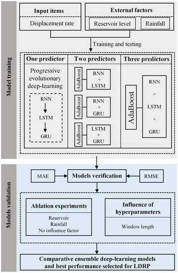 The processes of creating and validating the proposed models are presented in Figure 5. The landslide displacement rate is triggered by two external causes—rainfall and reservoir water level; these were analyzed to develop the AdaBoost RNN, LSTM, and GRU coupling model, along with six comparison models. The training data set used to train the prediction model covered the period from 3 July 2021 to 31 October 2021, while the testing data set comprised the landslide displacement data from 1 February 2022 to 27 March 2022. Root mean square error (RMSE) and mean absolute error (MAE) metrics were used as common measures of prediction accuracy. Then, ablation experiments were set to study the importance of landslides’ influencing factors. By changing the length of the window, its influence on prediction could be clarified. Finally, comparative ensemble DL models were utilized and the best performance for LDRP was selected.