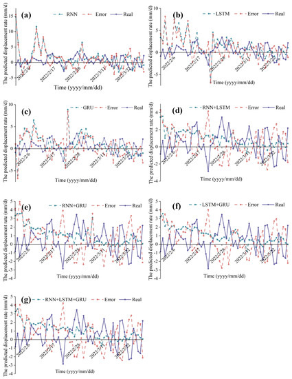 The predicted landslide displacement rate of each model: (a) RNN; (b) LSTM; (c) GRU; (d) RNN+LSTM; (e) RNN+GRU; (f) LSTM+GRU; (g) RNN+LSTM+GRU.