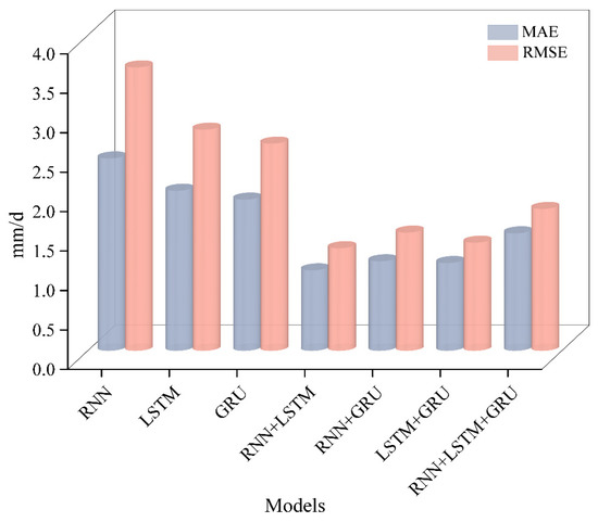 In Figure 10, the absolute error of each predicted model was drawn. As is shown in Figure 11, the coupling algorithm of RNN and LSTM performs the best in terms of prediction, with MAE and RMSE scores of 1.019 and 1.37, respectively. Moreover, it is evident from Figure 11 that the coupled models outperform the single model, and the coupling of the two models was better than that of the three models.