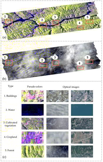 Comparison of pseudocolor and optical maps of five land-use types. (a) The pseudocolor map from 2017. (b) The Landsat8 optical map from 2017, provided by the Geospatial Data Cloud site, Computer Network Information Center, Chinese Academy of Sciences (http://www.gscloud.cn, accessed on 23 October 2022). (c) The optical and pseudocolor maps representation of the five regions in (a,b).