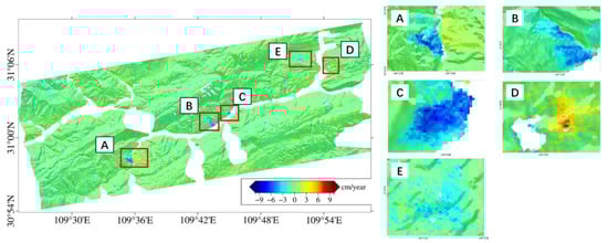 SBAS-InSAR average rate results. (A–E) show the deformation details of the main landslides.