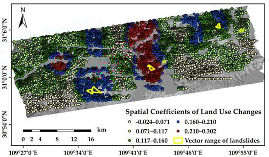 Thereafter, we used the GWR model to ensure spatial heterogeneity over the whole area. The results showed that slope, aspect, elevation, undulation, land-use changes, distance from the water system, etc., had different effects on the landslide rate in different geographical locations. In the study area, land-use change had a significant effect on the landslide rate, and the affected area coincided with the landslide area monitored by SBAS-InSAR, which further confirmed the conclusion proposed in this paper that land-use change affects landslide distribution.