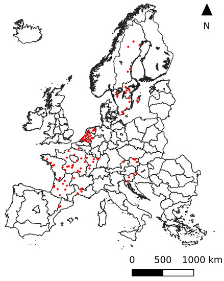 A total of 100 sites were selected to test the reconstruction method (see Figure 1), following a similar approach as in AI4Boundaries [34]. In this parallel research project on mapping crop field boundaries, a random stratified sampling method was designed to extract image chips from various landscapes. The sample was drawn from six European countries for which public parcel data are available: Austria, Spain, France, Netherlands, Slovenia, and Sweden. Each test site covers 256 by 256 pixels, corresponding to 2560 by . This is still sufficiently large to contain some contextual information for visual interpretation and can be processed on a computer with relatively low memory constraints (). The majority of pixels was vegetated land, the land cover in focus for this study. Both agricultural land ( of all pixels) and forest () were represented. Agricultural land included non-irrigated arable land (), pastures (), and a mosaic of small cultivated land parcels with different cultivation types (). Non-irrigated arable land is defined as cultivated land parcels under rainfed agricultural use for annually harvested non-permanent crops, normally under a crop rotation system, including fallow lands within such crop rotation [35]. Forested pixels were either broad-leaved forest (), coniferous forest (), or a mixture of both (). The remaining non-vegetated pixels included artificial surface and water bodies.