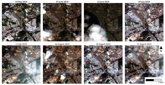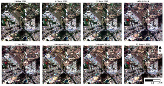 The ground sampling distance (GSD) of the bands in the visual and near infrared is , whereas the GSD of band B12 in the short wave infrared is . All selected bands were resampled to based on the nearest neighbor to obtain a regular gridded data cube. In addition to the spectral bands, Sentinel-2 products are delivered with a scene classification (SCL) band, which is an output of the Sen2Cor atmospheric correction processor [37]. It distinguishes 11 classes including information on clouds and cloud shadows. The products downloaded covered all acquisitions from beginning of December 2018 to the end of January 2020 with a cloud cover of less than . A subset of eight acquisitions for one of the test sites in France under various atmospheric conditions is shown in Figure 2.