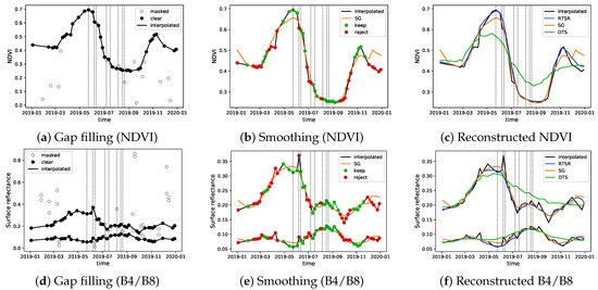 The reconstructed reflectance time series is initialized as the long-term change trend . If, for a given acquisition i, the interpolated NDVI value (calculated from the interpolated reflectance ) shows a higher value than the current NDVI estimate (calculated from the estimated reflectance ), then the corresponding interpolated reflectance value is assumed to be reliable and replaces the current estimate (green dots in Figure 3e). Else, the current estimate is retained in favor of the interpolated reflectance value that is assumed to be noisy for the given acquisition i (e.g., orange dot in Figure 3e). By comparing the green and orange dots in both Figure 3b,e, it is shown that the decision which value to select (smoothed or interpolated version) is driven by the NDVI time series.