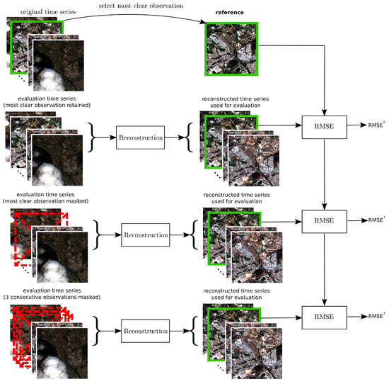 Low TSI values indicate smooth time series and high TSI values indicate noisy time series for a specific spectral band . A similar evaluation method was conducted in [42,44]. Reconstruction methods with a high level of smoothing are expected to perform well on the TSI metric. However, they risk concealing the temporal changes of interest. Clear observations with low noise content should be represented in the reconstructed time series. A second evaluation metric was therefore based on the error between the reconstructed time series and the original observation in clear conditions (). For each test site, was selected as the acquisition with the maximum number of clear pixels. The reconstructed time series was then compared to the observed time series at acquisition time (see top of Figure 4). Scatterplots were created per spectral band based on all clear pixels p in a test site (N in total). Pixels masked as not clear were not taken into account. In addition, the root mean squared error () was calculated as: