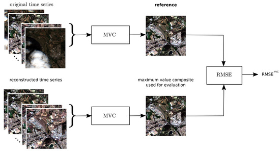 Within the context of time-series reconstruction, vegetation indices such as the normalized difference vegetation index (NDVI [17]) have the interesting property that they are usually depressed in cloudy or poor atmospheric conditions [18]. In [19], NDVI was analyzed under different observation conditions. The authors demonstrated that the NDVI values for all land cover types increase with lower aerosol concentrations, near-nadir viewing and high solar illumination. It was therefore concluded that “the best possible pixel value for a particular location is achieved by choosing the highest pixel value from multi temporal data”. High NDVI values can therefore be assumed to be more trustworthy than low NDVI values. This has been successfully used to reconstruct time series of NDVI by approaching the upper NDVI envelope via an iterative process [20,21,22]. The maximum NDVI composite is also based on this property. It creates a single noise-free image from a series of images by selecting the acquisition with the maximum NDVI value [19,23,24]. An overview of techniques to reduce noise of NDVI time series is provided in [25].
