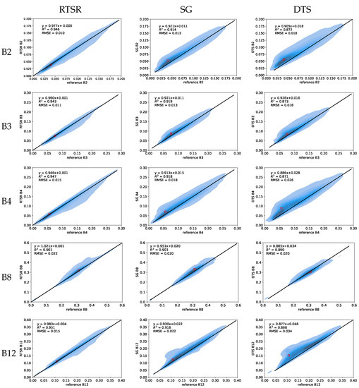 Scatterplots for the spectral bands under study were then created for the same test site (Figure 7). The pixel values of the observed and the reconstructed time series are compared at acquisition time and visualized based on the kernel density estimate. It is shown that the proposed RTSR method outperforms SG and DTS. The linear regression model indicates a better fit for RTSR, with a strong correlation (). In general, the SG- and DTS-reconstructed surface reflectance values over-estimated the observed surface reflectance value. This is also illustrated for the example pixel indicated by the red square in Figure 7 (except for DTS in B8). The time series in Figure 3f is based on the same pixel. Both SG- and DTS-reconstructed values for the clear observation on 23 May 2019 (first vertical line) indeed over-estimate the observation in B4 (lower graph). For this particular pixel and acquisition time, only SG over-estimated the observation in B8. The DTS-reconstructed surface reflectance in B8 was slightly lower than the clear observation, as can seen in the upper graph in Figure 3f. The RTSR reconstructed value shows little bias in any of the bands.