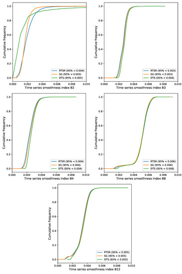 The smoothness for the three methods was evaluated by calculating TSI according to Equation (2). A cumulative frequency distribution representing all pixels aggregated for all test sites is shown in Figure 8. The results show little difference in the smoothness between the three reconstructed methods, with values for the 95 percentile that are almost identical. Most variation was found for spectral band B2, with smoothest results obtained for the non-adaptive Savitzky–Golay filter (SG) followed by the proposed RTSR and DTS. This is not surprising, as the SG-reconstructed time series represents the long-term change trend with a relatively wide half-width of the smoothing window. Both RTSR and DTS constrain the smoothing filter to capture dynamic changes of interest in vegetation.