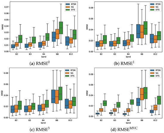 As shown by the box plot in Figure 9a, the RMSE for RTSR was found to be smaller than for SG and DTS for the majority of test sites. This was the case for all spectral bands. The difference was most distinct in the visual to near infrared part of the electomagnetic spectrum. Furthermore, in the short wave infrared (band B12), the minimum as well as the 25 percentile value (Q1) and the median value of the RMSE was minimum over all test sites for the proposed RTSR. However, for some test sites the RMSE was higher for the RTSR than for the SG without adjusting the smoothed value, as expressed by the slightly higher 75 percentile value (Q3) and upper whisker ().