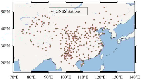 To test the reliability and superiority of the DAAA method proposed in this study, a numerical simulation scheme is first designed. In this simulation test, the latitude range varies from 10 °N to 55 °N, and the longitudinal range varies from 70 °E to 140 °E. In height, the range varies from 100 km to 1000 km. The discretized intervals are 0.5° and 1° in the latitudinal and longitudinal directions, respectively, and the altitudinal interval is 30 km. To perform the IED inversion, the geographical coordinates of 245 stations of the Crustal Movement Observation Network of China (CMONOC) are used to construct the coefficient matrix of the tomographic system. The geographical locations of the 245 GNSS stations are shown in Figure 1.