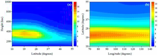 Two-dimensional images of initial IED distributions obtained from NeQuick model. (a) 114°E; (b) 350 km. The unit of IED is 1011 el/m3.