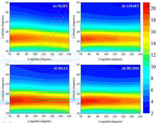 The reconstructed images of three algorithms and the IRI 2016 model at the altitude of 350 km. (a) MART; (b) AMART; (c) DAAA; (d) IRI 2016. The unit of IED is 1011 el/m3.