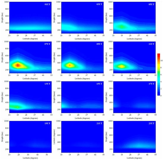 Figure 5 illustrates the time-series variations of the IED along the longitudinal chain of 114°E. The reconstructed images show that the IED values are the highest over time. The IED values reach their maximum at 07:00UT, and then the IED values begin to decrease. At 21:00UT, the IED value decreases to its lowest point. Subsequently, the IED values start to increase again. Meanwhile, Figure 5 shows that the equatorial anomaly core, with little inclination, is formed at 05:00UT and disappears at 11:00UT. On the whole, this experiment indicates that the IED values in northern China are generally smaller than those in southern China. This phenomenon demonstrates that the IED variations are closely related to the latitude.