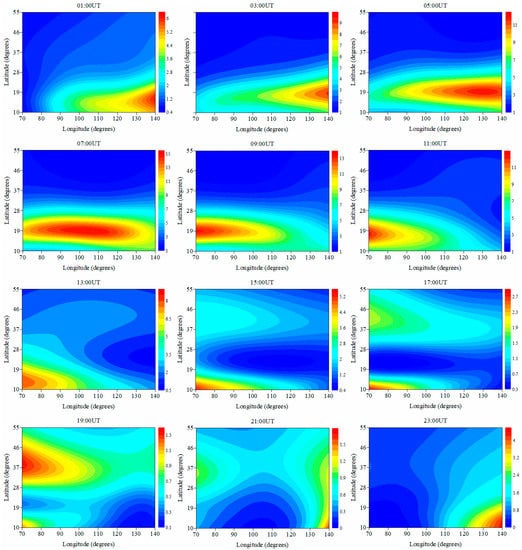 Figure 6 gives the diurnal variations of the IED at the altitude of 350 km. The subgraphs show that the IED values in eastern China are higher than those in western China between 01:00UT and 05:00UT. Subsequently, the IED in western China starts to increase as time elapses. Finally, the IED values in eastern China are lower than those in western China between 09:00UT and 19:00UT. Figure 6 also shows that the IED values first varies from small to large, and then the value varies from large to small as the earth rotates from west to east.