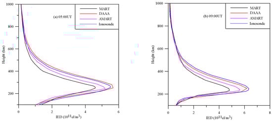 Figure 7 compares the reconstructed IED profiles of three algorithms at 05:00UT and 09:00UT with those recorded by the ionosonde station located in Wuhan. The comparisons show that the reconstructed IED profiles of the DAAA method are in agreement with those obtained from the ionosonde station. This comparison validates that the reconstructed results by the DAAA are more accurate than those of the MART and the AMART methods.