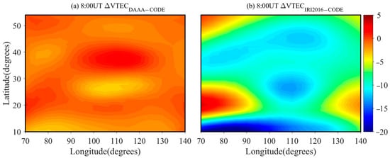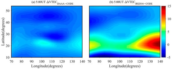 The images of the differential VTEC between the inverted VTEC and the ionospheric products of CODE at 5:00UT. (a) Differential VTEC between the DAAA method and CODE; (b) Differential VTEC between IRI 2016 model and CODE. The unit of VTEC is TECU.