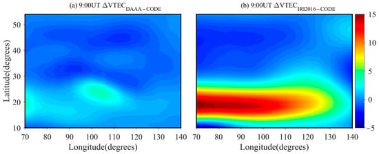 The images of the differential VTEC between the inverted VTEC and the ionospheric products of CODE at 9:00UT. (a) Differential VTEC between the DAAA method and CODE; (b) Differential VTEC between IRI 2016 model and CODE. The unit of VTEC is TECU.