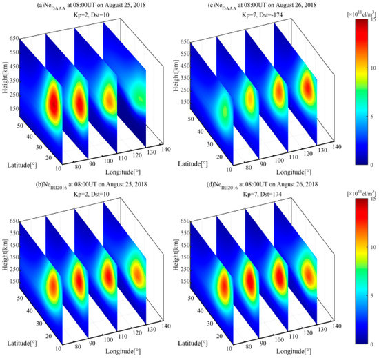 The reconstructed three-dimensional IED distributions by the DAAA and IRI 2016 model at 8:00UT on 25 and 26 August 2018.