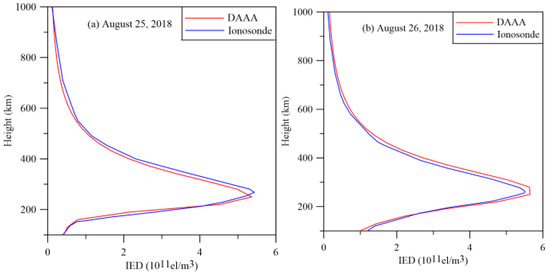 The comparison of the reconstructed profiles by DAAA with those recorded by ionosonde station located at Wuhan. (a) 25 August 2018; (b) 26 August 2018.