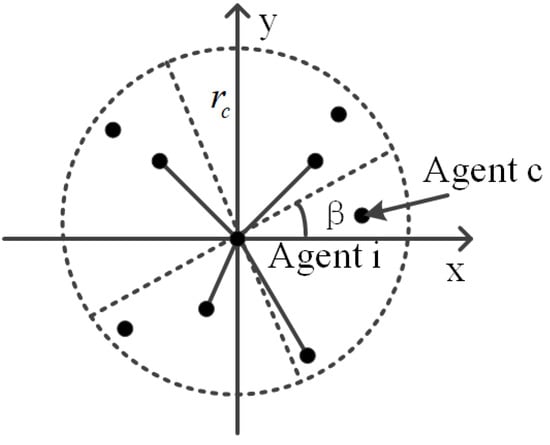 The circular area within the sensing distance of agent i is the communication range . The communication range is evenly divided into m fan-shaped communication sectors, forming a set . Figure 2 displays the optimized distribution of communication sectors []. By rotating the two-dimensional coordinate axis of agent i clockwise, the number of neighbors distributed in each fan-shaped area is reduced to a minimum standard deviation. The rotation angle can be expressed as: