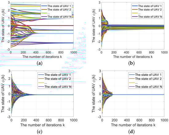The synchronization factor is used to adjust the step value of the state between two UAVs. As shown in Figure 5, the synchronization factor is positively correlated with the system synchronization convergence speed. If the synchronization factor is too small, the system will diverge to multiple local centers, and the synchronization will fail.