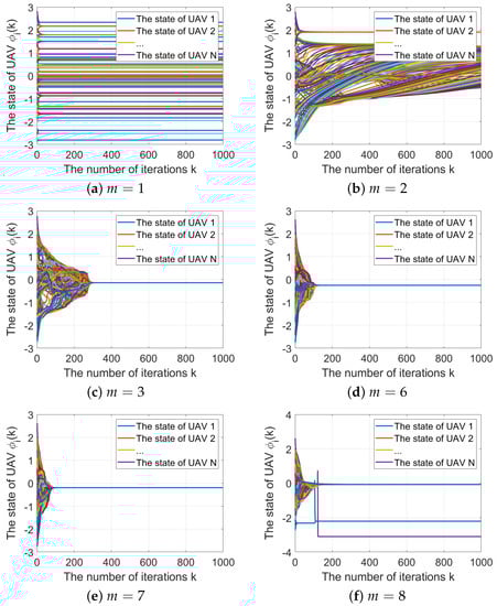 The simulated synchronization convergence performance with different communication sectors is shown in Figure 4. With one communication sector, the system synchronously selects one UAV from the neighbors for evolution, resulting in the divergence of the system. An increased number of communication sectors improves the convergence performance of the system while increasing the amount of calculations. Therefore, the selected number of communication sectors should reduce the amount of calculations as much as possible while ensuring good convergence performance.