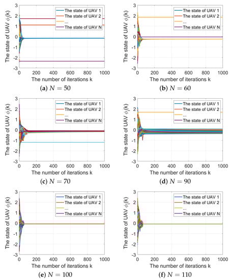 In order to verify the relationship between the number of communication sectors and the system convergence performance, a comparative experiment is performed, the number of UAVs is set to 50–120. The convergence and running time of the system are shown in Figure 6 and Table 4.