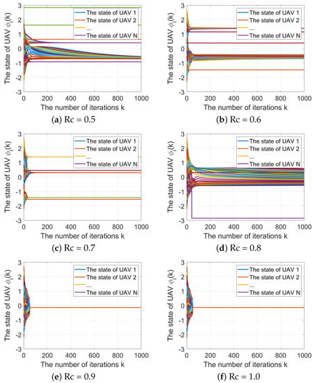 It can be seen from the simulation results that when the communication radius is less than 0.8, the system cannot achieve convergence. When the communication radius is 0.9∼1.1, the system can achieve convergence. The increase in the communication radius will increase the amount of calculations, so the time required for convergence shows an increasing trend.