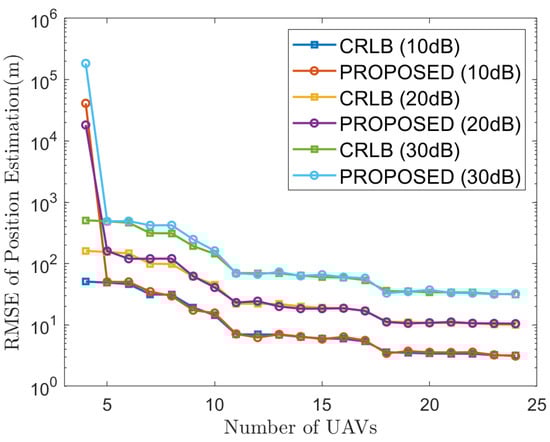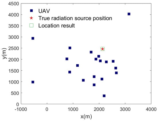 The simulation scenario of moving source localization based on UAV swarms is shown in Figure 8. The actual target is placed at (2130, 2460) m. A total of 20 UAVs are randomly distributed in an area of 5000 × 4500 m. The number of Monte Carlo cycles is set to 1000. In the experimental scene, we use the Cramereau lower bound (CRLB) and the root mean square error (RMSE) as the standards to measure the localization performance with different parameters.