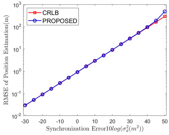 The position estimation RMSE and velocity estimation RMSE under different synchronization errors are presented in Figure 9 and Figure 10. Both position RMSE and velocity RMSE are very close to the CRLB as the synchronization error increases.