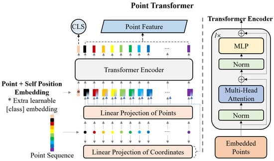 Our proposed network is illustrated in Figure 2. To handle 3D point clouds, we consider the neighborhood P = {p1, p2, …, pk} of each point p comparable to a flattened 2D patch in ViT and map P into a linear projection to make point embedding E k×d, where d is the number of channels after mapping. We have