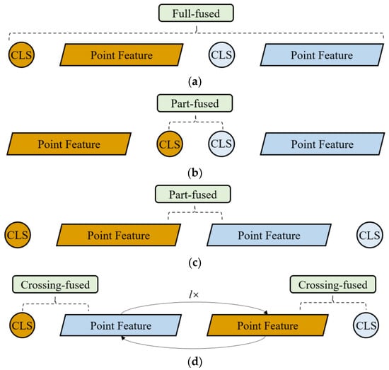 There are mainly three types of fusion algorithms: full-fused, part-fused and crossing-fused [32]. Full-fused means that all features in Xb and Xa participate in each operation of f, as shown in Figure 3a. However, it is unacceptable because such fusion requires considerable computing time. Figure 3b,c shows two types of part-fused processing, one with only the point features fused, and the other with only the [CLS] token fused. Obviously, the key information of the two representations is not fully exploited.