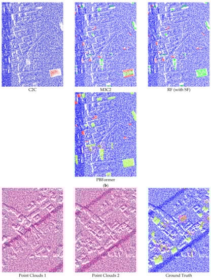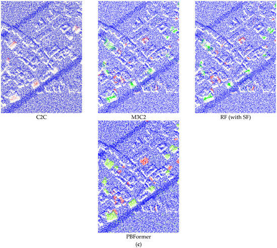 It can be seen that: (1) The results of methods processing DSMd with empirical thresholds consistently failed to perform satisfactorily on all sub-datasets. Otsu’s threshold algorithm [59] and the opening filter [60] can significantly improve the performance, meaning that nearly all of their results achieved more than 80% of mIoU. However, in these results, we can observe the change of 3D point clouds only from the top view. (2) FFN and Siamese CNN showed inconspicuous results despite being trained. A possible reason is that the two networks have simple architectures and are not specially designed for point clouds. (3) C2C only provided binary results, and the accuracy was directly determined by the empirical threshold. Although we additionally used the fuzzy threshold, it is still unsatisfactory, even in terms of visual effect (as shown in Figure 5a–c). (4) M3C2 achieved results close to the lowest mIoU. This hand-crafted feature is not robust enough, especially when there is excessive noise in the point clouds. (5) The RF (with SF) algorithm also obtained merely ordinary results due to the limitation of hand-crafted SF. (6) Last but not least, our PBFormer outperforms the above approaches regarding mIoU and performs better on 5 sub-datasets.