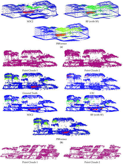 In this paper, PBFormer was compared with other methods regarding the Urb3DCD benchmark. In addition to the better results achieved with our network, several issues remain to be addressed. With sufficient prior information, C2C is still a method worth considering due to its high efficiency. However, due to its over-dependence on the threshold and its ignoring of the local geometric structure, C2C usually fails to achieve satisfactory results. For a better visual effect, we tried to blur the threshold and obtained some faded areas in Figure 5 and Figure 6, but the result was not perfect. Although the centers of the changed regions can be distinguished, the boundaries between the changed and unchanged regions are vaguer. The result of M3C2 is also unsatisfactory, both visually and qualitatively. The visual results of M3C2 seem to be smoothed because all corresponding points of the points distributed on the edge are not found by M3C2, and they remain in the gray area. RF (with SF) is more reliable than C2C and M3C2, which are relatively sensitive. While all three belong to the one-stage strategy, the quantitative and visual result of RF (with SF) reflects the gap between machine learning-based and traditional methods. A possible reason for the poor results of M3C2 and RF (with SF) is the lower resolution of the dataset. Even for the sub-dataset-2, the resolution is about 10 points/m2. In this case, where the detection (LODetection) level may exceed the magnitude change, M3C2 applied to detect changes at the centimetric scale will perform less well on a dataset at the metric scale. This could explain the less adequate result of RF (with SF) on sub-dataset-1 (0.5 point/m2) and the improvement in sub-dataset-2. PBFormer is also affected by the resolution, and point clouds with a higher resolution help PBFormer to achieve better CD quality. However, when processing sparse point clouds, PBFormer could still obtain enough points to learn the characteristics between two inputs by kNN, which is part of the reason why PBFormer works better than other methods.
