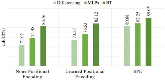 Moreover, the replacement of the feature fusion modules shows that the BT decoder has another significant impact on performance. The mIoU score also exceeds 80 when only the BT decoder is used in PBFormer. Similarly, based on three positional encoding strategies, the mIoU scores over 80 prove that the BT decoder could effectively learn the difference between bitemporal point clouds.