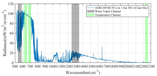 The AERI, a ground-based passive interferometer, was specifically designed and fabricated by the University of Wisconsin [34] for the Department of Energy’s Atmospheric Radiation Measurement (ARM) program [35,36]. AERI can measure downwelling atmospheric emitted radiances from the wavelengths of 3.3–18.2 m (520–3000 cm) at a spectral resolution of better than 1 cm [37], which has been widely applied to the retrieval of temperature and humidity profiles in the atmospheric boundary layer [13,38]. The AERI is a multi-channel ground-based passive instrument, including 311 water vapor absorption channels and 244 carbon dioxide channels, as shown in Figure 1, which are used for the retrieval of humidity and temperature profiles, respectively [39].